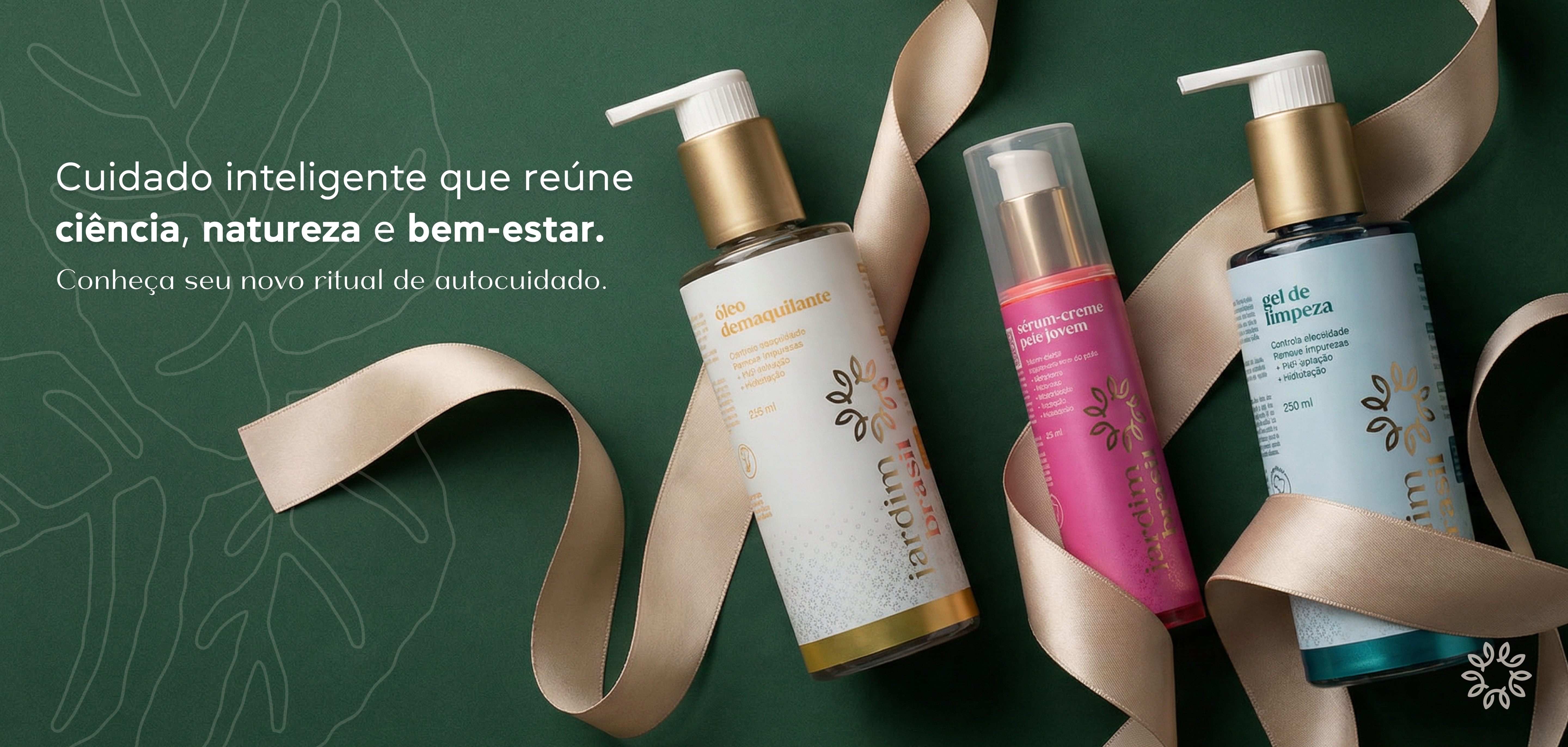 Para finalizar, o Sérum-Creme Pele Jovem Jardim Brasil combina nanotecnologia e ativos da biodiversidade para hidratar profundamente, estimular firmeza e elasticidade e prevenir os primeiros sinais da idade. Sua textura cremosa de rápida absorção reduz linhas finas, uniformiza o tom e devolve luminosidade. Entre os ativos estão extrato de açaí, guaraná, manteigas amazônicas, vitamina C, nano colágeno, nano ácido hialurônico e nano niacinamida. O aroma natural de maçã e o iluminador dourado trazem frescor, equilíbrio mental e um glow saudável instantâneo.