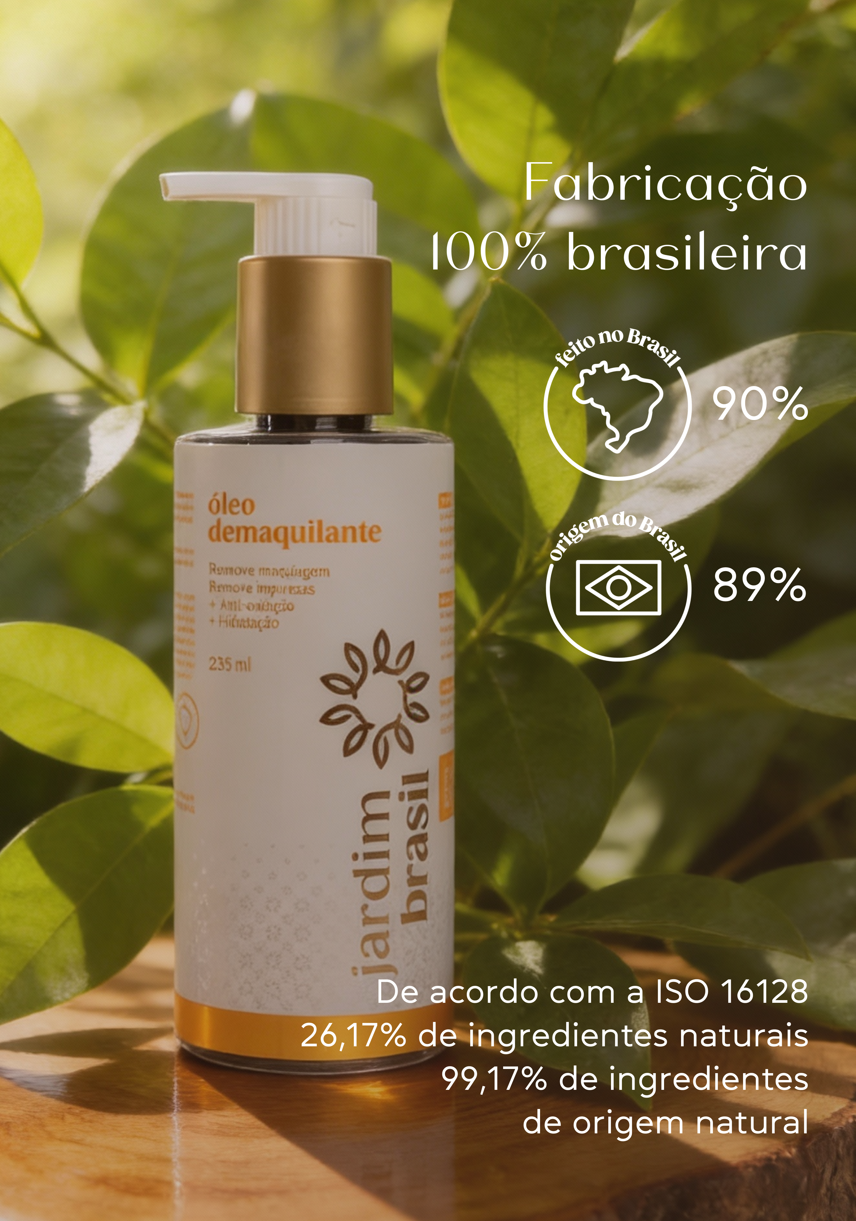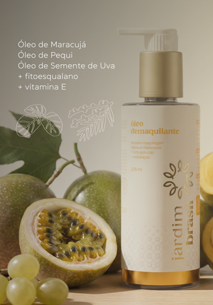 O Óleo Demaquilante Jardim Brasil remove maquiagem, protetor solar e resíduos mais difíceis com alta performance de demaquilagem, sem esforço e com toque leve. Sua textura gel-to-milk transforma o ritual: começa como gel, emulsiona com água, vira um “leite” e enxágua completamente, deixando a pele limpa, macia e confortável, sem sensação oleosa ou pegajosa. Mas o diferencial está no sensorial que vai além da pele: o aroma inspirado no maracujá foi avaliado por neurociência e gerou emoções que a mente traduz em sentimentos de relaxamento e alegria, elevando a limpeza a um momento real de bem-estar. A fórmula também entrega hidratação e apresenta potencial antipoluição (in vitro) em modelo laboratorial. Indicado para double cleansing (Óleo Demaquilante + Gel de Limpeza) e também pode ser usado sozinho em rotinas de pele muito seca, quando você quer limpar com potência e confortar com leveza.